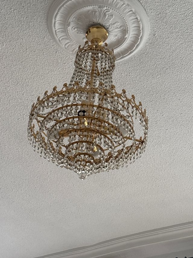 Dettagli del prodottoLampadario elegante con dettagli in cristallo e struttura dorata. Aggiunge un tocco di sofisticatezza a qualsiasi spazio. Design classico, cristalli pendenti, finitura metallica dorata. La descrizione è stata tradotta automaticamente.