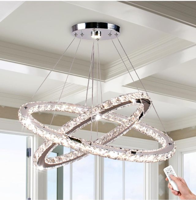Lampadario in cristallo Lampadari moderni con telecomando Plafoniera ovale a 2 anelli Lampada a sospensione a LED bicolore Lampada a sospensione per soggiorno Sala da pranzo Camera da letto (regolabile)