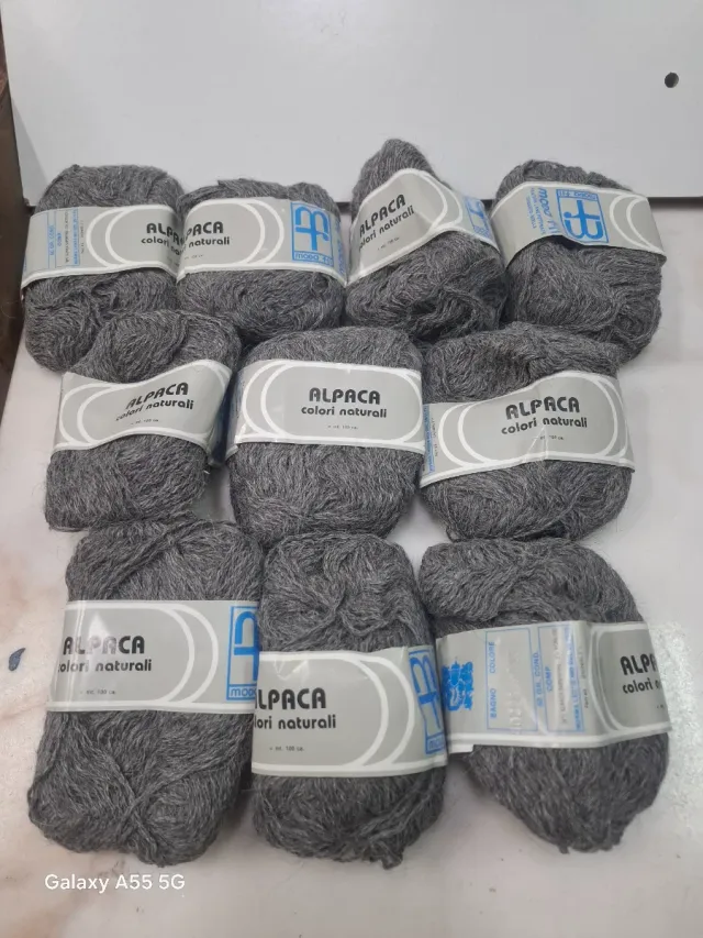 Dettagli del prodottoLotto di 10 gomitoli di lana alpaca color grigio naturale.