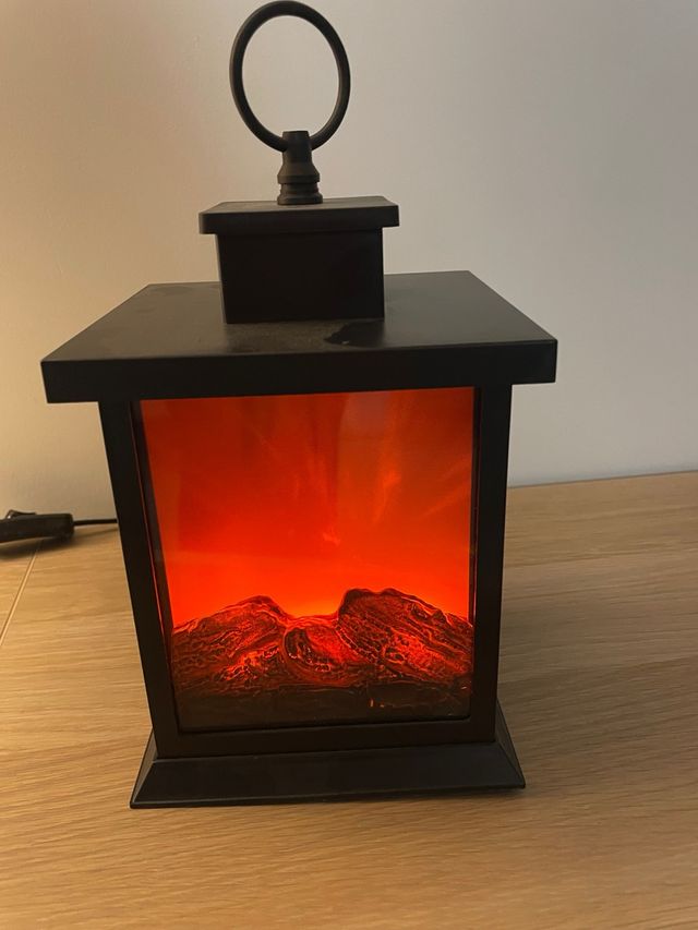 Lanterna decorativa con un suggestivo effetto camino. - Design moderno e compatto. - Illuminazione calda e avvolgente. altezza 28 cm larghezza 15 cm
