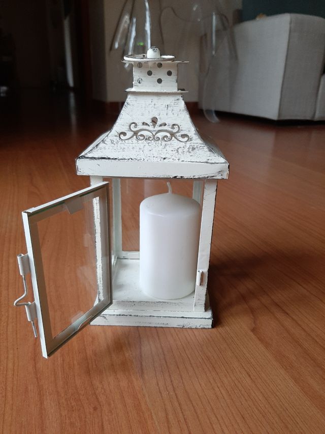 Lanterna portacandela shabby, in metallo e vetro, colore bianco, pari al nuovo, candela in omaggio alta 22 cm diametro base 11 x 11 cm