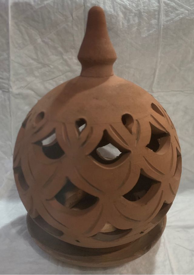 Lanterna in terracotta siciliana. Piattino con piccolo difetto. Altezza 23cm diametro piattino 15 cm.