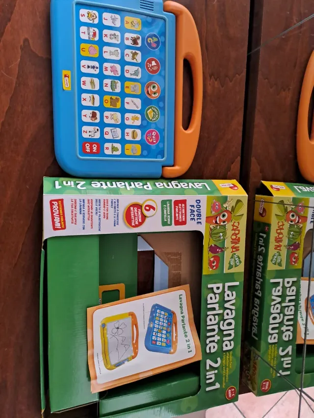 Gioco alfabetiere e prime parole elettronico (pile non incluse) e lavagna scrivi e cancella. Segni di utilizzo visibili nelle foto.