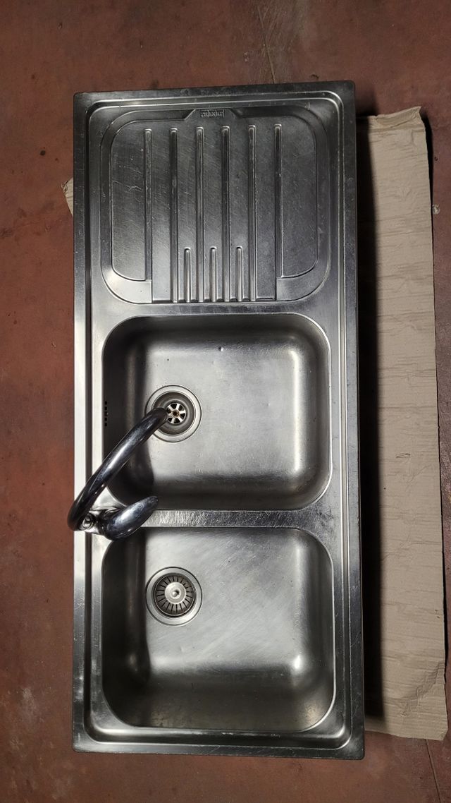 Dettagli del prodottolavandino a incasso doppia vasca con sgocciolatoio. completo di rubinetto miscelatore e filtro rubinetto, flessibili, pilette e un filtro piletta in acciaio. le misure sono standard 116cm × 48cm