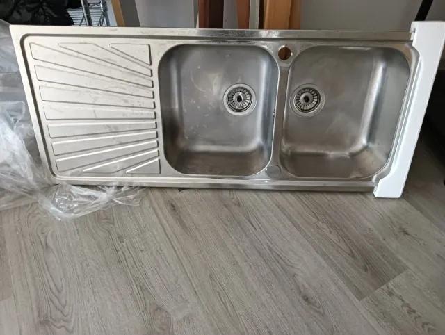 Lavandino da cucina in metallo con finitura argentata - Doppio lavello. - Vasca con scivolo integrato. - Foro per rubinetto.