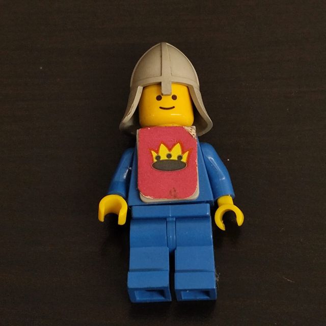 Minifigure Lego vintage del cavaliere blu. - Modello: Cas082s - Anno di produzione: 1978 - Colore: Blu - Accessorio: Scudo con corona