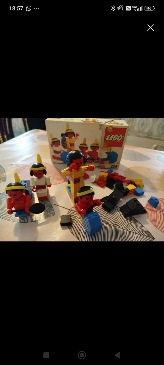 Dettagli del prodottoSet di costruzione vintage Lego, riferimento 215, con tematiche di indios americani. Include figure di indios con copricapi, pezzi di costruzione Lego e scatola originale. La descrizione è stata tradotta automaticamente.