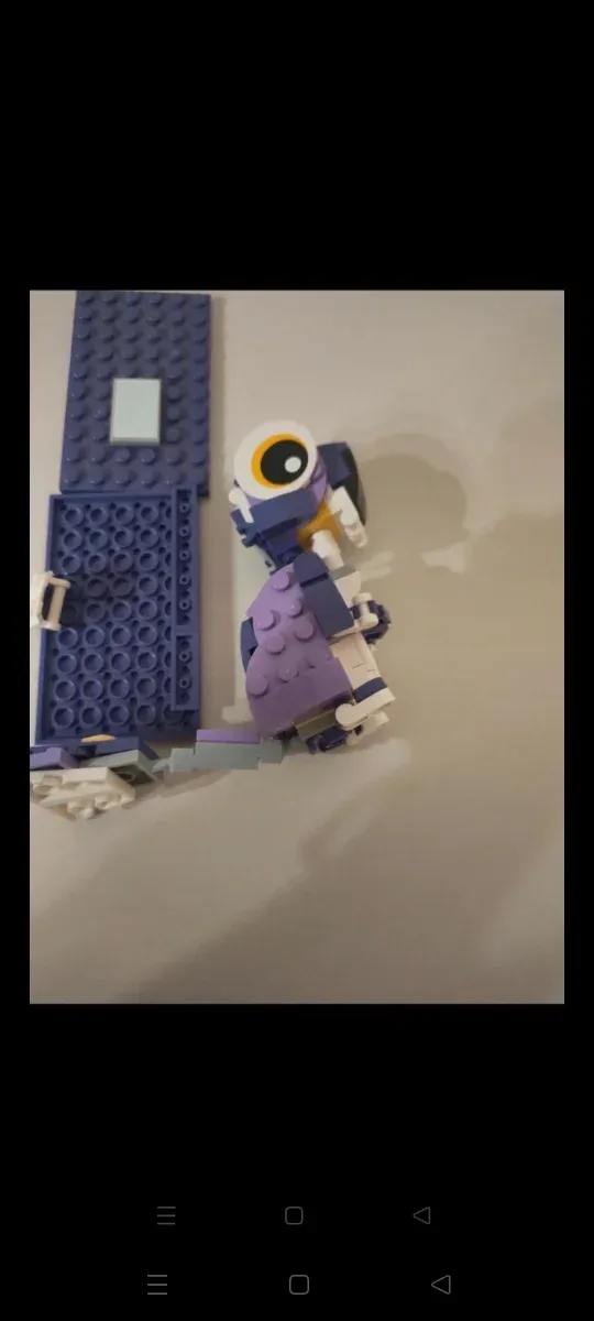 Personaggio costruito con mattoncini Lego Creator. - Colore principale viola. - Dettagli bianchi e gialli. - Occhio grande e distintivo.