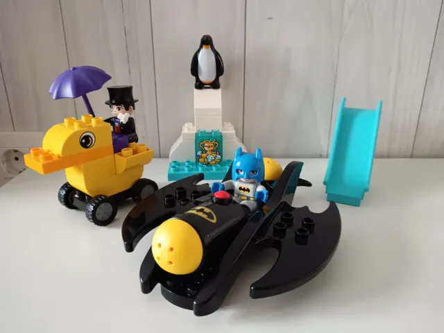 Dettagli del prodottoSet di costruzione Lego Duplo di Batman. Include figure di Batman e Pinguino. Veicolo tipo Batmobile. Figura di papero giallo con ombrello. La descrizione è stata tradotta automaticamente.