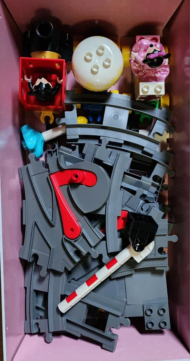 Set di binari e accessori per trenino Lego Duplo. - Binari curvi e dritti. - Semaforo con barriera. - Personaggi e elementi decorativi.