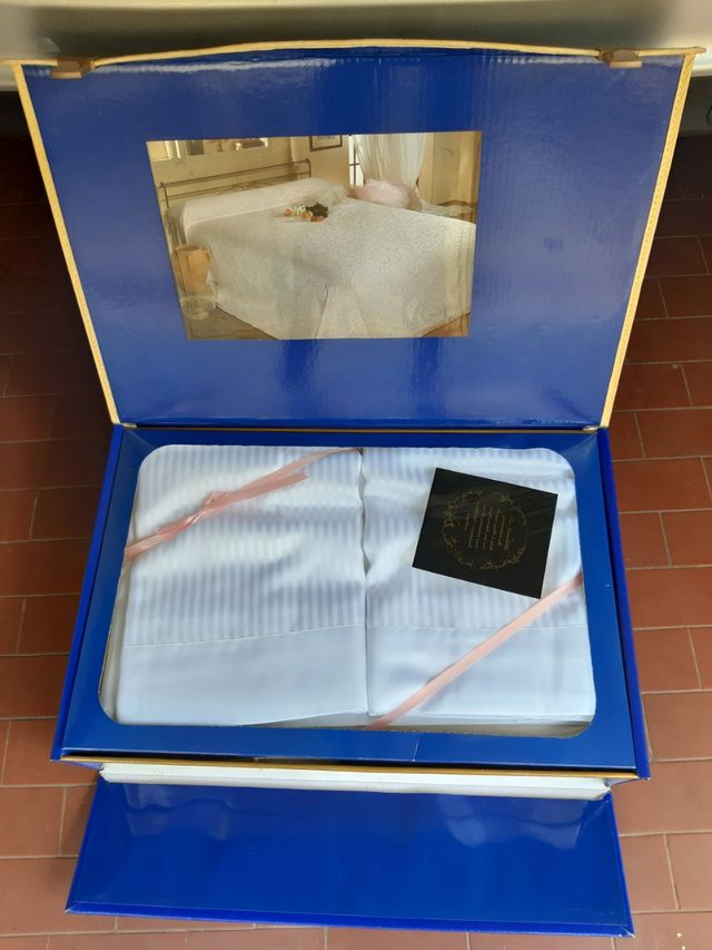 Dettagli del prodottoLe lenzuola sono state vendute, è rimasto solo il copriletto. Nuovo, mai usato, nella confezione originale. La scatola è un po' rovinata dall'umidità e ci sono piccoli segni anche sui capi (dovrebbe venire via lavando i capi con candeggina o bicarbonato e acqua ossigenata). Ho sgomberato l'armadio di mia suocera, sono rimasti solo 3 copriletti nuovissimi e ancora imballati, se acquistati insieme faccio sconto