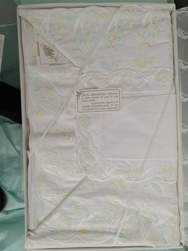 Dettagli del prodottoLenzuola matrimoniali ricamate, sopra sotto e 2 federe, 100% cotone, nuove, dimensioni 270x300 circa. + 4 cuscini. Misure del prodotto