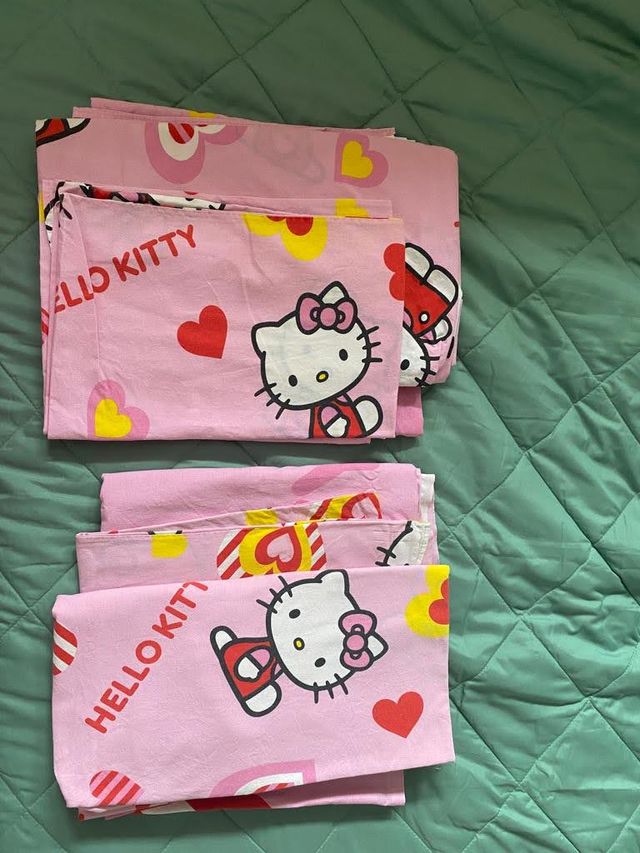 2 completi lenzuola per letto singolo Hello Kitty formato da coprimaterasso, lenzuolo e federa per cuscino. Il prezzo si riferisce ad un solo completo