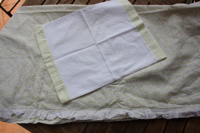 Federa 35 x 28 cm, chiusura con lembo, bianca con bordo giallo a pallini bianchi.
