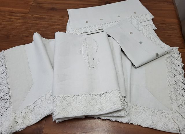 lino a tre teli uniti come si faceva anticamente, con bordo in uncinetto e iniziali CP tutto eseguito a mano,anche se mai utilizzato , portato in lavanderia prima di