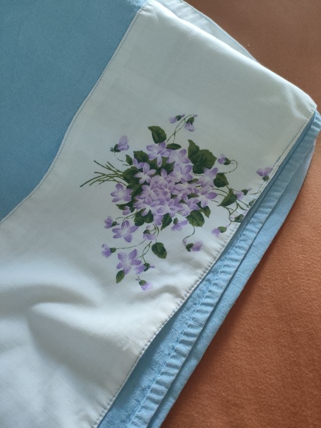 Lenzuolo azzurro con ricamo bianco e fiori violetti. da una piazza +2 centrini ovali