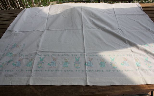 Morbido e robusto Cotone. Bianco, con risvolto con pizzo, ricami di fiori azzurri e rosa, doppio orlo a giorno.
