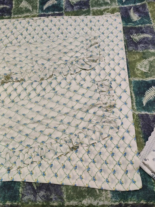le due federe hanno i voulant. la stoffa dove appoggia la testa leggermente scolorita rispetto il lenzuolo. da lavare.nessuna rottura