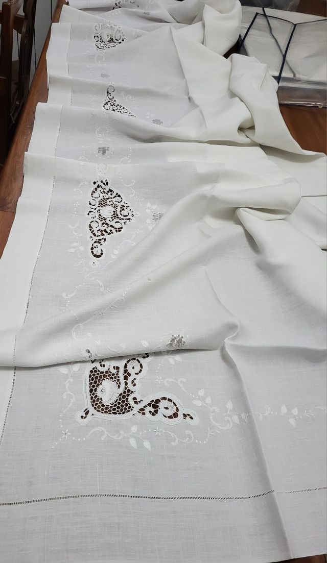 Dettagli del prodottoBellissimo lenzuolo p.lino facente parte del corredo tessuto molto sottile e finemente e interamente ricamato a mano