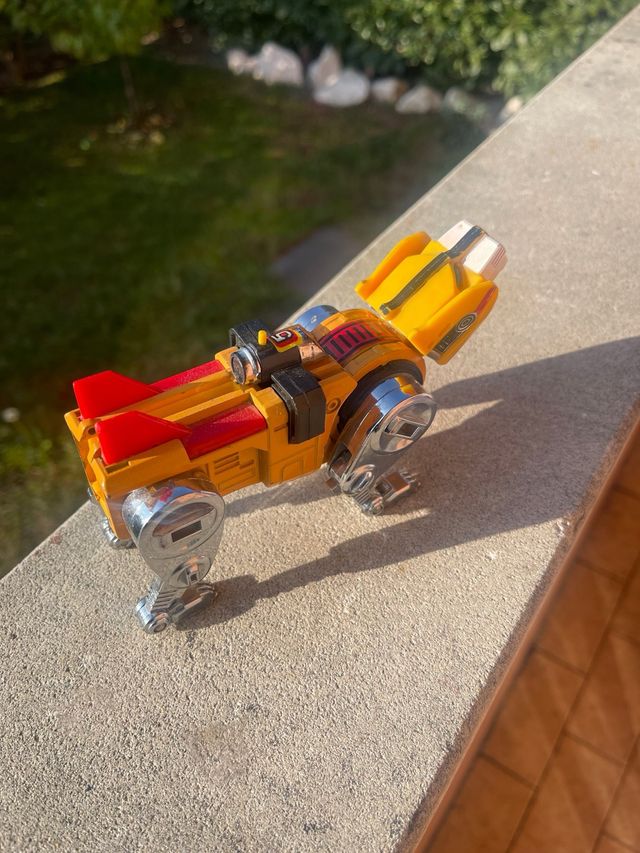 Action figure vintage del Leone n. 5 di Voltron. - Colore giallo predominante. - Dettagli rossi e neri. - Parti metalliche argentate.
