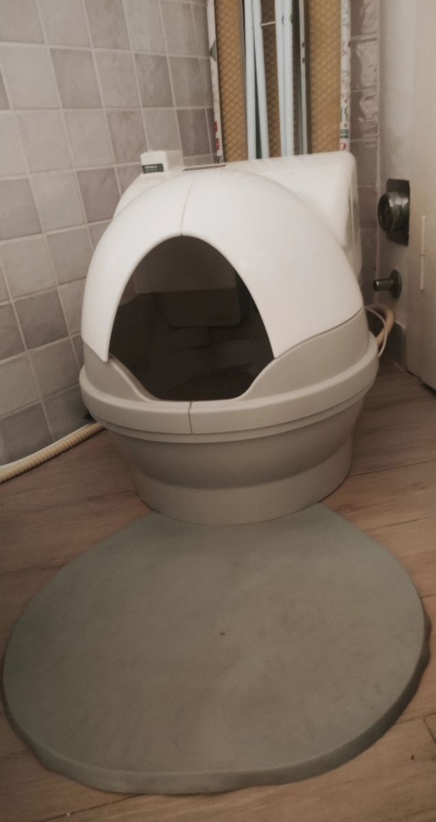 Lettiera Autopulente per gatti. Completa di manuale di istruzioni e adattatori idraulici per collegarla allo scarico del wc.