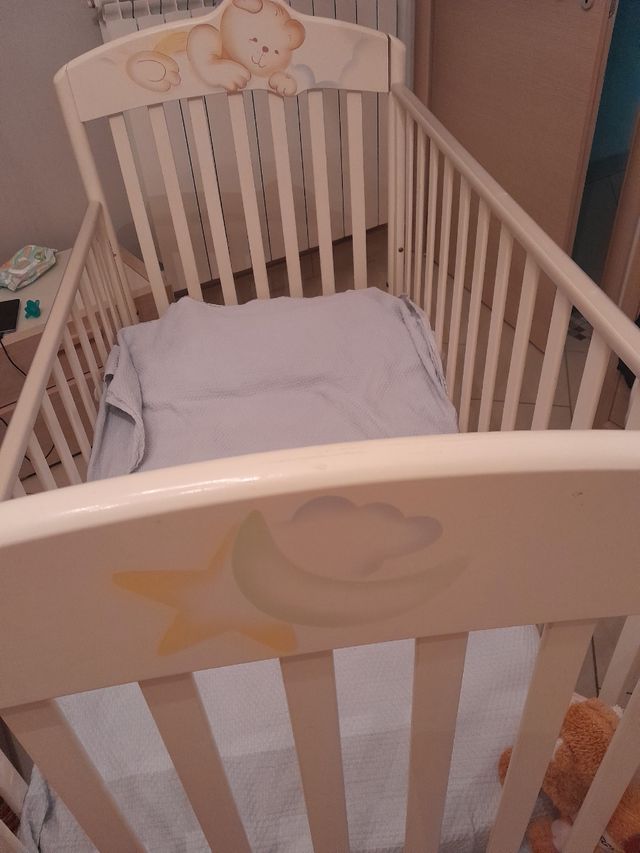 Lettino bambini, con rotelle e sbarre estraibili. Regalo materasso, cuscino e lenzuola