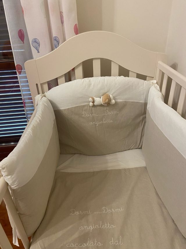 Dettagli del prodottoVendo lettino Nanán (smontato), in legno laccato con vernice atossica a base di acqua di un tenue color tortora. E’ dotato di un comodissimo cassettone per poter contenere tutto il necessario per la nanna. Ogni componente del lettino Tato è all’insegna della totale sicurezza e comodità del bebè, le sponde sono regolabili, impreziosito nella parte frontale da un nastro tortora e panna in cotone chambre dalla forma perfetta. Vendo con rete a doghe non regolabile in altezza, materasso, copri materasso impermeabile, paracolpi e piumone sfoderabile. Presenta piccoli segni di usura. Dimensioni: 132x74x105 cm Misure del prodotto
