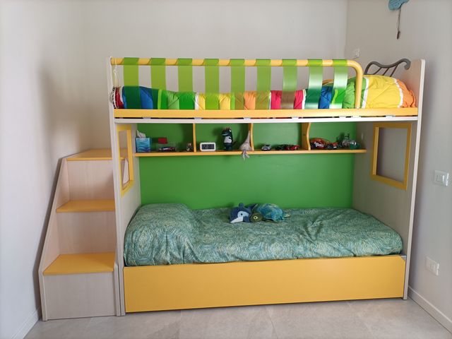 Dettagli del prodottoVendo letto a castello in legno giallo e verde completo di scaletta laterale con gradoni, passatoia laterale e cassetti estraibili.