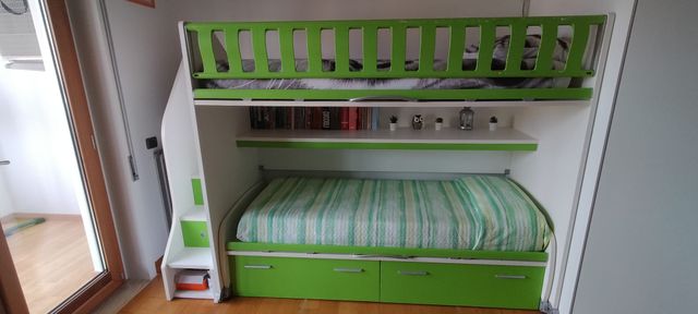 Dettagli del prodottoLetto a castello con materassi in ottimo stato. Leggermente rovinata la vernice sulla sbarra del letto. Molto comoda sia la salita grazie alle scaletta laterale e la possibilità di rifare il letto di sopra grazie al corridoio. Misure del prodotto