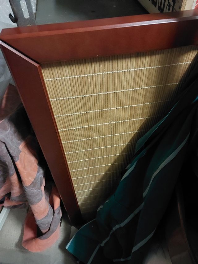 Dettagli del prodottoletto giapponese composto da struttura matrimoniale con doghe e futon 1 piazza e mezza cotone e lattice. La struttura è colore nero e marrone come 1 dei 2 comodini. La testiera è marrone chiaro e scuro come l altro comodino.