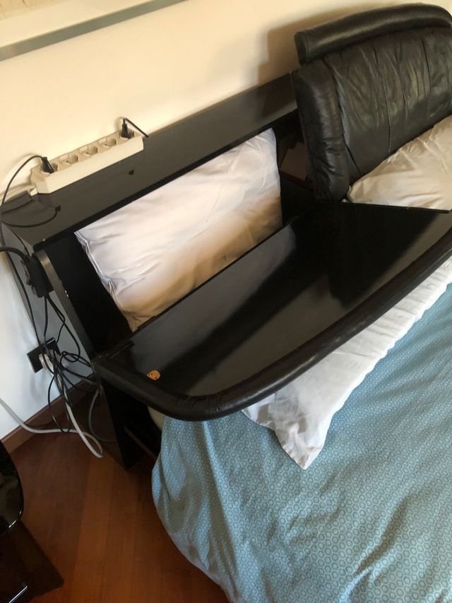 Letto con testata in simil pelle nera e contenitore per cuscini e coperte. Misura 230x175. Struttura letto in legno laccato lucido compresi 2 faretti