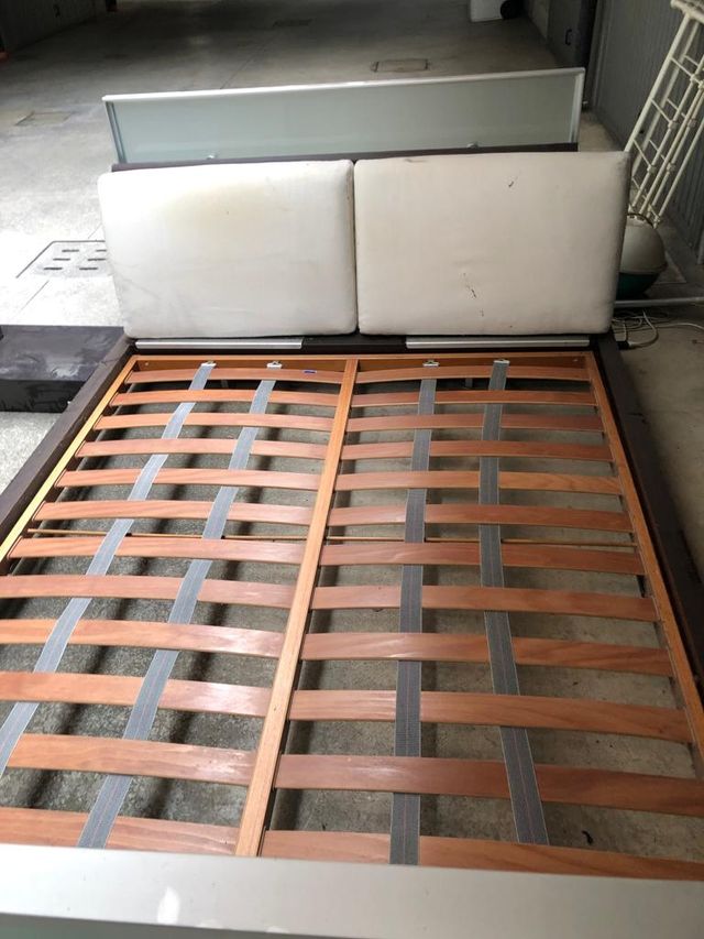 Dettagli del prodottoletto matrimoniale in wenge. modello zen testata e pediera in cristallo opaco con rete ortopedica in doghe di legno. sulla testata cuscini in tessuto panna sfoderabili e lavabili. prezzo nuovo 1000 euro