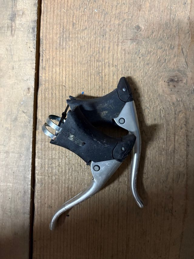 Coppia di leve freno per bicicletta. - Materiale: metallo e gomma. - Colore: argento e nero.