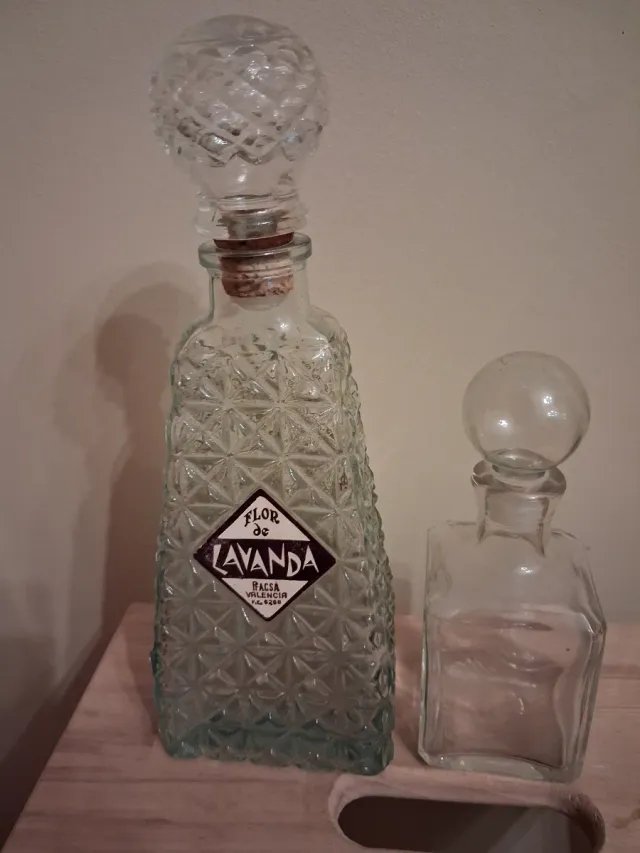 Dettagli del prodottoSet di due bottiglie di profumo antiche, perfette per collezionisti o decorazione - Grande bottiglia di vetro intagliato con etichetta Fiore di Lavanda - Piccola bottiglia di vetro con tappo sferico La descrizione è stata tradotta automaticamente.