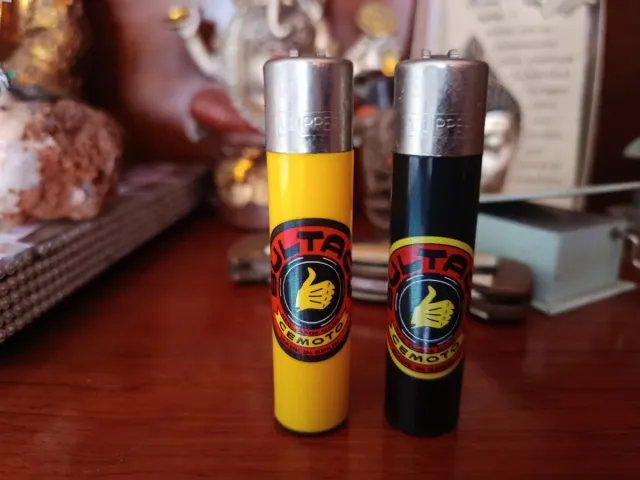 Dettagli del prodottoIn vendita due accendini Clipper da collezione. - Uno di colore giallo. - L'altro di colore nero. - Entrambi con design Cemoto e pollice in su. La descrizione è stata tradotta automaticamente.