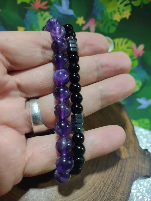 Set di 2 braccialetti con perline in ametista e onice