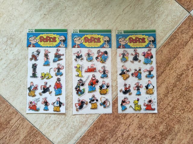 Dettagli del prodottoMagnifico lotto di 3 vecchie vesciche (tutte diverse) di adesivi tridimensionali fustellati di Braccio di Ferro e tutti i suoi amici dell'avventura (Olivia, Brutus, Cocoliso, Pilón, Eugenio,...)