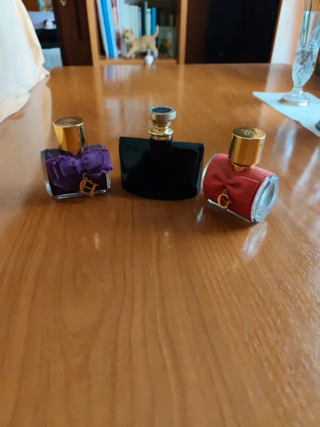 Dettagli del prodottoSet di tre bottiglie di profumo VUOTE solo per collezione. Due sono di Carolina Herrera e una di BVlgari - Bottiglia viola con fiocco e charm. - Bottiglia nera. - Bottiglia rossa con fiocco e charm. La descrizione è stata tradotta automaticamente.