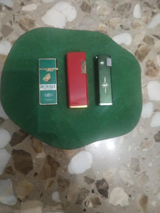 Dettagli del prodottoSet di tre vecchi accendini. Solo gli accendini, la base non è in vendita. - Accendino verde con design a stella. - Accendino rosso. - Accendino verde con il testo 'ROYALE MENTHOL'. Tutti e tre producono scintille quando premuti, a meno che non siano scarichi di benzina. La descrizione è stata tradotta automaticamente.