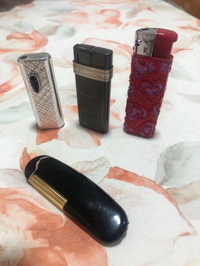 Dettagli del prodottoSet di quattro accendini da collezione con design vari. Da controllare e ricaricare con gas. Spese di spedizione a carico dell'acquirente. - Accendino argentato con motivo a rombi. - Accendino scuro con dettagli metallici. - Accendino rosso con design a cuori. - Accendino nero con dettagli dorati. La descrizione è stata tradotta automaticamente.