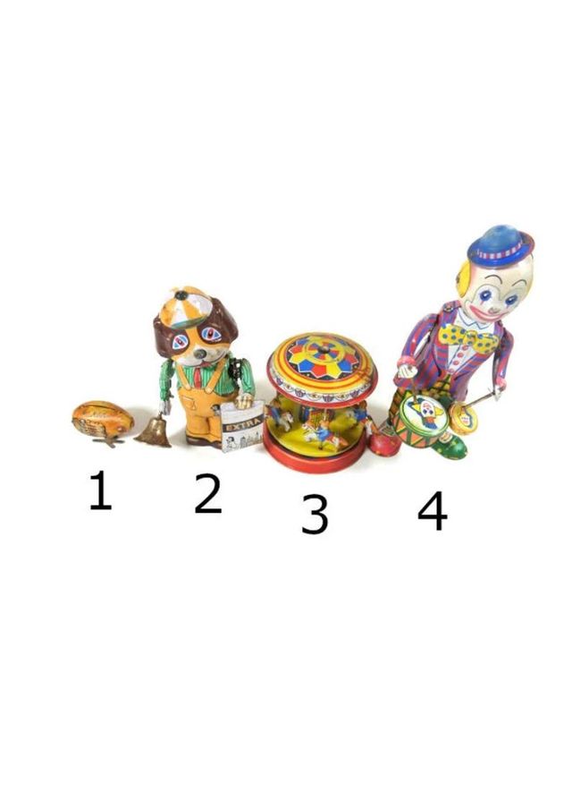 Dettagli del prodottoSet di quattro giocattoli vintage in latta, ognuno con un design unico e colorato.