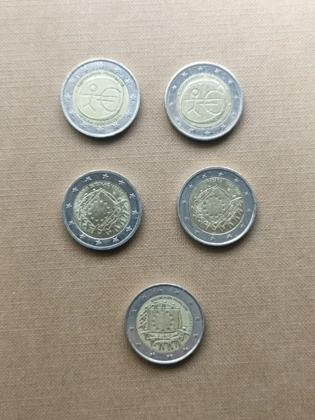 Set di cinque monete commemorative da 2 euro di diversi paesi. - Moneta della Repubblica Francese. - Moneta della Repubblica Federale di Germania. - Moneta di Spagna.