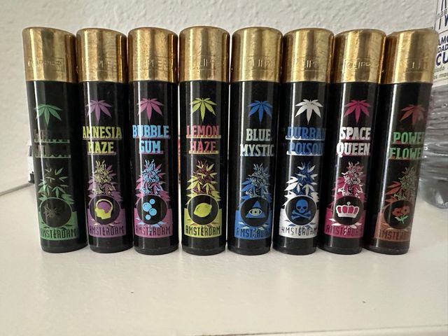 Dettagli del prodottoConjunto de 8 mecheros Clipper con diseños de diferentes variedades de cannabis y el logo de Amsterdam.