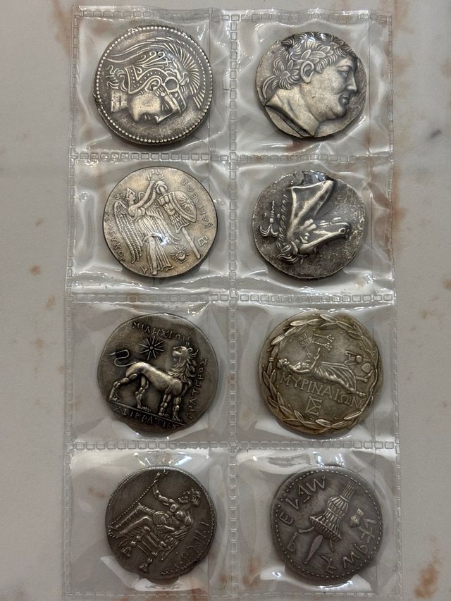 Dettagli del prodottoSet di 8 monete antiche provenienti dalla Grecia, ognuna con un design distintivo! RIPRODUZIONI OJO!!