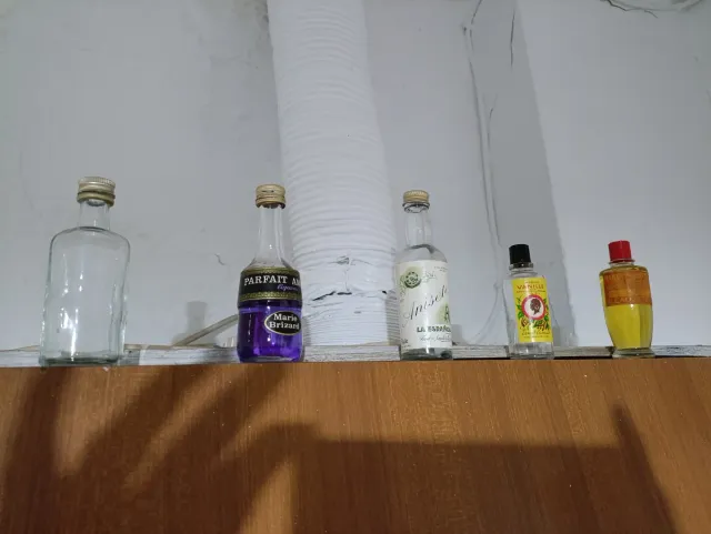 Dettagli del prodottoSet di piccole bottiglie antiche di diverse marche e contenuti. - Bottiglia di liquore Marie Brizard Parfait Amour. - Bottiglia di Anis La Española. - Bottiglia di Vanille. - Bottiglia di Acqua di Colonia. - Bottiglia vuota. La descrizione è stata tradotta automaticamente.