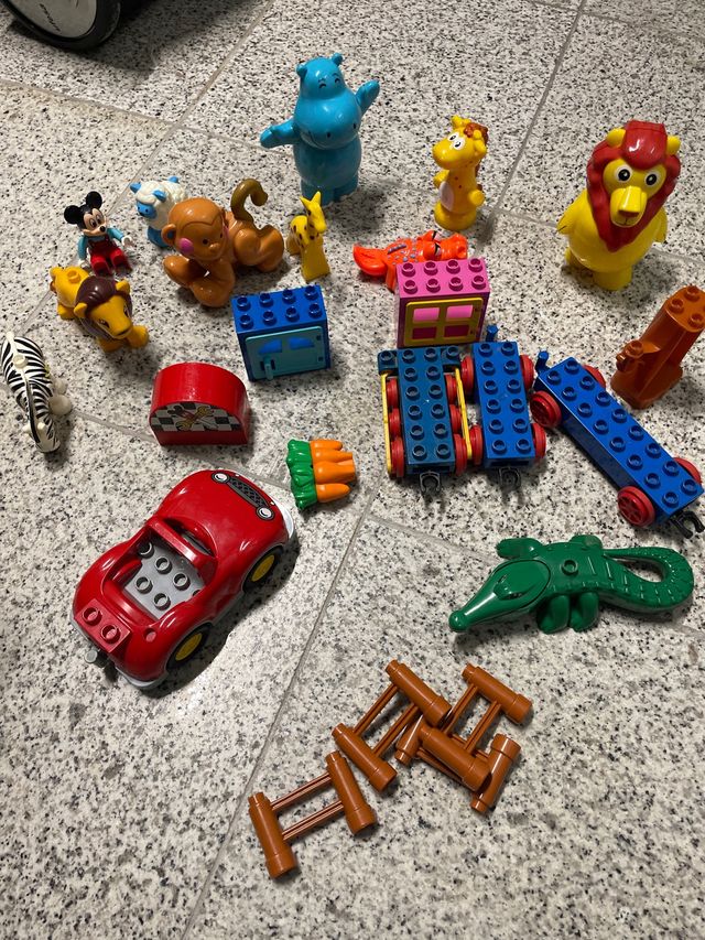 Dettagli del prodottoLotteria varia di giocattoli di costruzione e figure. Include pezzi di Lego Duplo. Figure di animali come ippopotamo, leone, zebra, coccodrillo, scimmia e giraffa. Macchina rossa. Personaggio tipo Mickey Mouse. Blocchi di costruzione di diversi colori e forme. La descrizione è stata tradotta automaticamente.