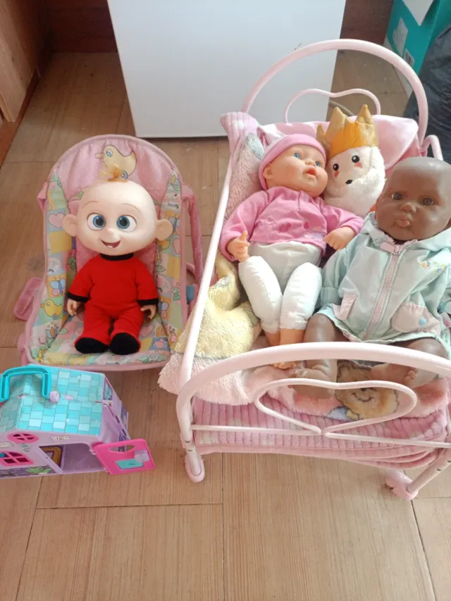Dettagli del prodottoSet di articoli per bambole, ideale per giocare. - Culla/amaca rosa con stampa. - Bambola con vestito rosso. - Bambola con vestito rosa e cappello. - Bambola con vestito blu. - Casa giocattolo. - Figura di personaggio con corona. La descrizione è stata tradotta automaticamente.