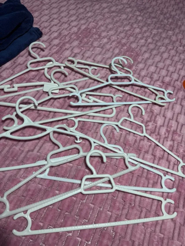 Set di appendiabiti in plastica bianca. Design leggero e resistente. Ideali per organizzare il tuo armadio. Ogni appendiabiti ha scanalature per evitare che i vestiti scivolino.