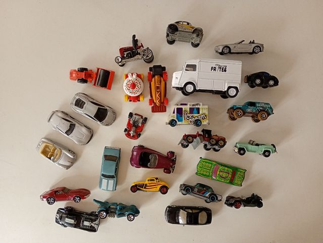 Un sacco di veicoli giocattolo. - Include auto, camion e altri veicoli. - Vari colori e disegni.