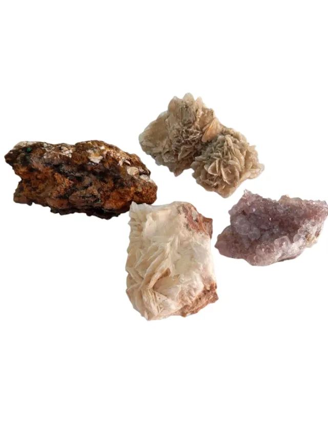 Dettagli del prodottoSet di minerali vari, ideale per collezionisti. - Minerale di colore marrone rossastro con venature verdi. - Due formazioni di cristalli a forma di rosa del deserto, colore beige. - Cristallo di ametista di colore lilla. La descrizione è stata tradotta automaticamente.